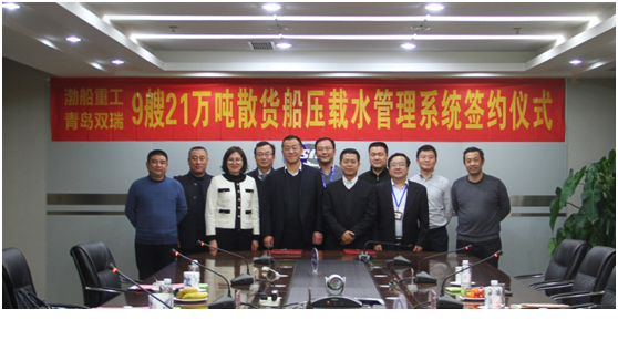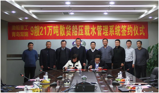 1月10日,渤海船舶重工有限責任公司(以下簡稱渤船重工)與青島雙瑞海洋環(huán)境工程股份有限公司(以下簡稱青島雙瑞)在青島雙瑞舉行了9艘21萬噸散貨船壓載水管理系統(tǒng)簽約儀式。渤船重工黨委書記、總經(jīng)理孫東明一行5人和青島雙瑞公司相關(guān)領(lǐng)導出席了簽約儀式。