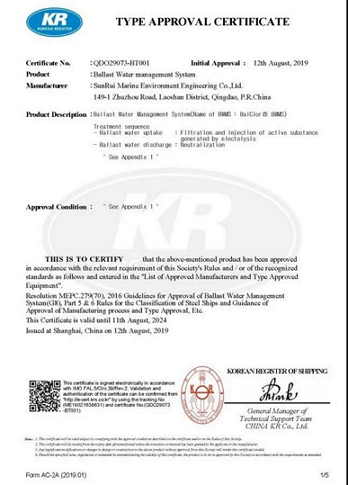 青島雙瑞對(duì)此積極響應(yīng),于2018年啟動(dòng)了基于新G8導(dǎo)則的KR型式認(rèn)可申請(qǐng),在KR驗(yàn)船師見(jiàn)證下,完成多項(xiàng)關(guān)鍵技術(shù)測(cè)試,順利完成了工廠審核,成功獲得KR型式認(rèn)可證書(shū)。這是KR首次將新G8證書(shū)頒發(fā)給韓國(guó)以外的船舶壓載水處理設(shè)備廠商,公司全球第二家獲得該認(rèn)證。本型式認(rèn)可認(rèn)定了BalClor?壓載水管理系統(tǒng)“高效過(guò)濾+支路電解滅活”處理技術(shù)及BC-150至BC-8000共14個(gè)型號(hào),覆蓋公司壓載水處理設(shè)備全系列產(chǎn)品。